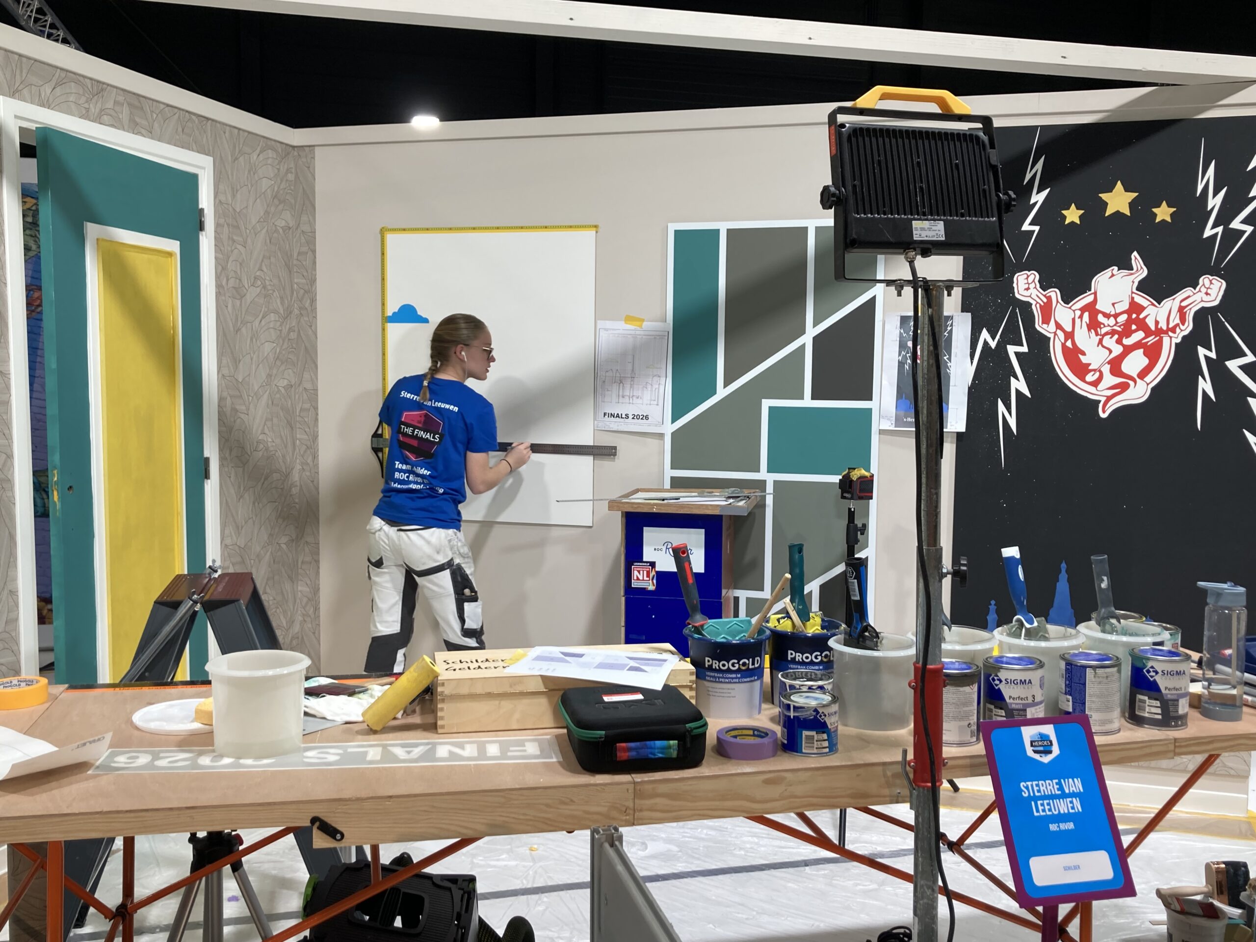 Kort daarna was het de beurt aan Sterre van Leeuwen. In de Brabanthallen in Den Bosch etaleerde zij haar talent voor het schildersvak. Een extra diepe buiging is hier op zijn plaats: Sterre is pas in september gestart met haar opleiding, maar stond nu al tussen de beste schilders van Nederland. Twee dagen lang werkte ze onder hoogspanning, maar met een glimlach, aan haar opdrachten.